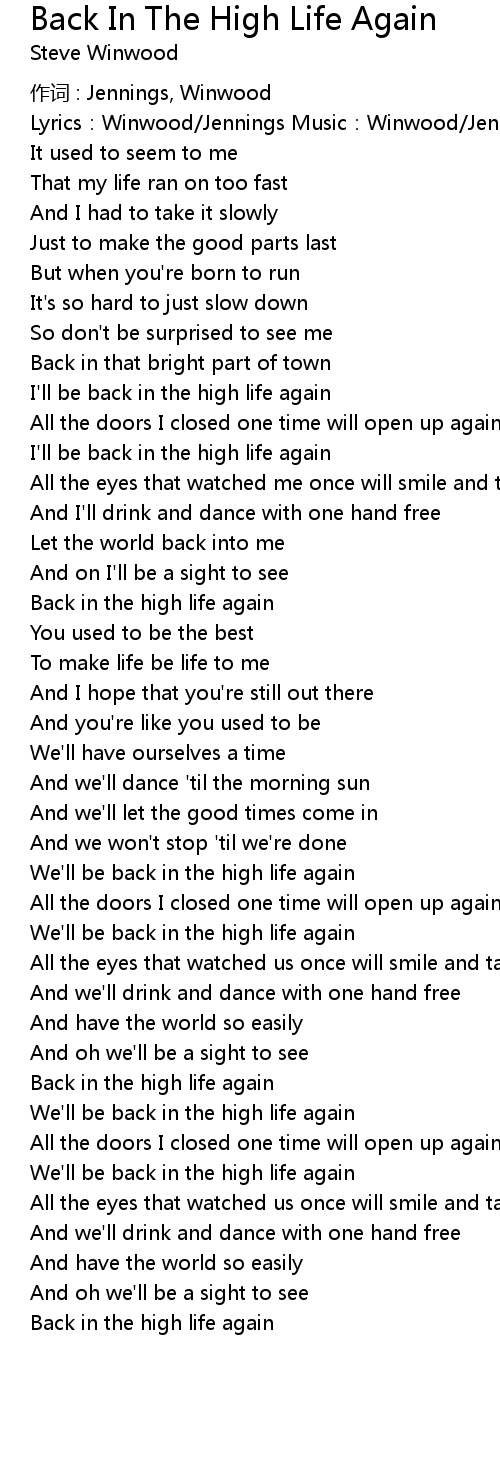 Let the world back into me. To make life be life to me. Watch the video for back in the high life again from steve winwood's back in the high life for free, and see the artwork, lyrics and similar artists. Back in the bright part of town i'll be back in the high life again all the doors i closed one time will open up again i'll be back in the high life again all thee eyes that watched me once will smile and take me in and i'll drink and dance with one hand free let the world back into me and, oh, i'll be a sight to see back in the high life again And i'll drink and dance with one hand free. Steve winwood back in the high life again lyrics: And have the world so easily. Back in the high life again. To make life be life to me. Back in the high life again we'll be back in the high life again all the doors i closed one time will open up again we'll be back in the high life again all the eyes that watched us once will smile and take us in and we'll drink and dance with one hand free and have the world so easily and oh we'll be a sight to see back in the high life again All the eyes that watched us once, will smile and take us in. And you're like you used to be. It used to seem to me that my life ran on too fast / and i had to take it slowly just to make the good parts last / but when you're born to run it's so hard to.