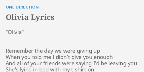 Olivia One Direction Lyrics - Harry Styles Explains What The One Direction Song Olivia Is Really About : Lyrics © bmg rights management, universal music publishing group, downtown music publishing.. Liam] please believe me, don't you see the things you mean to me? The lyrics of one direction's m.i.t.a.m album :) cause i love them and all the songs on the new album ♥ i hope this helps someone ! Las mejores canciones de daddy yankee. Remember the day we were giving up when you told me i didn't give you enough and all of your friends were saying i'd be leaving you she's lying in bed please believe me, don't you see the things you mean to me? I want to write you a song 10.